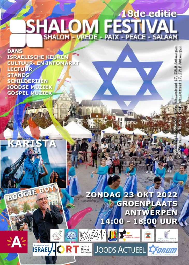 The Shalom Festival is an initiative of the Belgian Coalition for Israel, the Alliance for Peace in the Middle East, Koinonia Ministries, ORT Belgium, Joods Actueel, Belgian Friends of Israel, Forum of Jewish Organizations, Christians for Israel, Chrétiens Amis d ‘Israël, A-net, B’nai B’rith, Finjan and other Jewish and Christian organizations aiming to tell the truth about Israel, fight antisemitism and unite all people who are of good will, to build towards a better world.